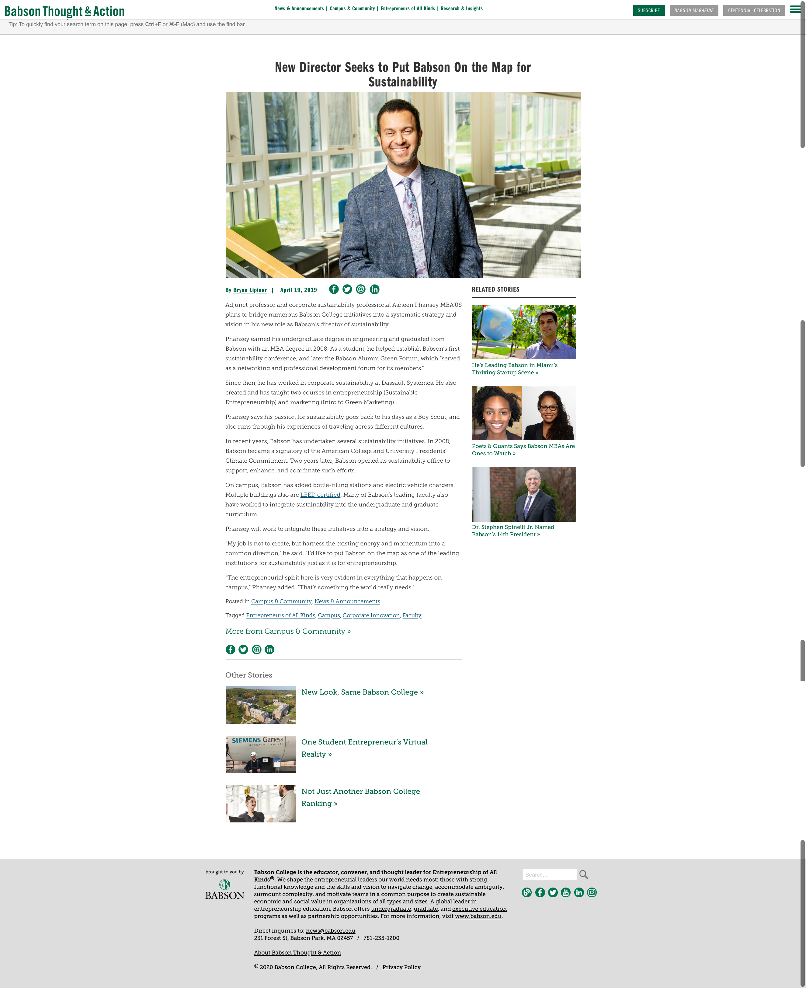 Adjunct professor and corporate sustainability professional Asheen Phansey MBA’08 plans to bridge numerous Babson College initiatives into a systematic strategy and vision in his new role as Babson’s director of sustainability. . . . He also created and has taught two courses in entrepreneurship (Sustainable Entrepreneurship) and marketing (Intro to Green Marketing).