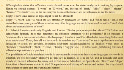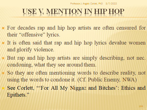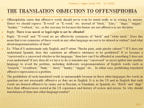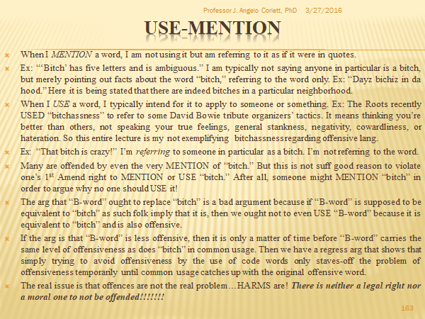Corlett also teaches the concepts of use-mention and “offensiphobia,” the idea that offensive words should never be written or spoken.