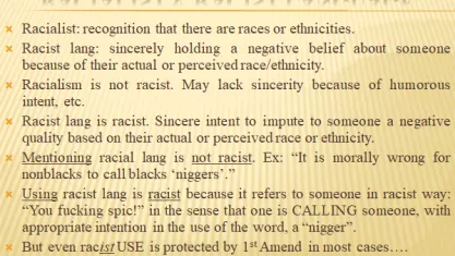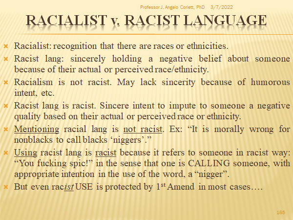 According to Corlett, “racialist” language simply acknowledges racial differences, while “racist” language conveys a sincere negative belief about someone due to their perceived racial identity.