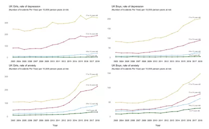 The graphs are just as shocking as those we showed for American adolescents in Chapter 7. Here are the trends in the UK, derived from analyses of medical records for a cohort of 9 million children and teens, from Cybulski et al. (2021).