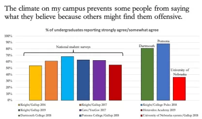 In sum, more data on college students’ attitudes toward free expression are needed at the national level and at the campus-specific level. National data are valuable. They provide benchmarks for schools to compare themselves and help identify broader trends that may be occurring among college students across the nation. Attempts to apply a single meta-narrative about free expression on campus from national surveys that aggregate the experience and perceptions of students across hundreds to thousands of campuses are flawed because such a narrative can obscure and mask the reality on any given campus.