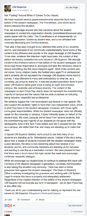 At the University of Wisconsin – Superior (UWS), an April Fools’ Day edition (are you sensing a theme here?) of the Promethean resulted in a similar, though fortunately much shorter, investigation. There, a UWS student complained that the April Fools’ edition was not sufficiently labeled as satirical and was offensive, prompting UWS to publicly condemn the Promethean and publicly announce — in a Facebook post — that it was investigating the student newspaper. UWS, while announcing its investigation, called for an open dialogue amongst its students. As I wrote at the time: