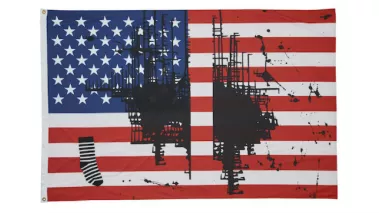 The artwork, “Untitled (Flag 2),” was created by artist Josephine Meckseper for a series called “Pledges of Allegiance,” featuring 16 artworks displaying a rotation of flags addressing a variety of themes and topics by artists from around the world. Meckseper describes her work as “a collage of an American flag and one of my dripped paintings which resembles the contours of the United States.” The series is a project of the New York-based arts nonprofit Creative Time.
