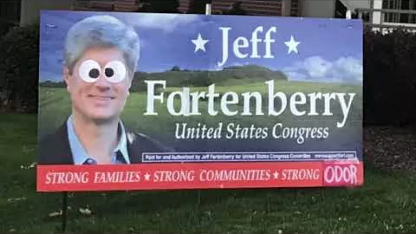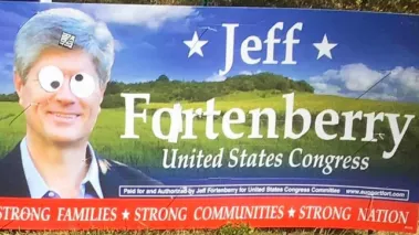 Lincoln Journal Star reporter Nancy Hicks described what happened to a campaign sign for Nebraska Rep. Jeff Fortenberry late last month as “[p]olitical vandalism … [with] a touch of humor.” Whoever defaced the poster opted for the “sophomoric” version of dissent — adding cartoonish googly eyes to Fortenberry’s face along with a few pieces of strategically placed tape that transformed his name to “Fartenberry.”