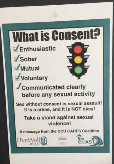 CCU’s new poster is an attempt to educate students on so-called “affirmative consent.” While no one argues with the notion that consent is required for sex, affirmative consent rules add a layer of confusion and bureaucracy, effectively forcing accused students to prove their innocence in a situation where there are typically no witnesses and no documentation.