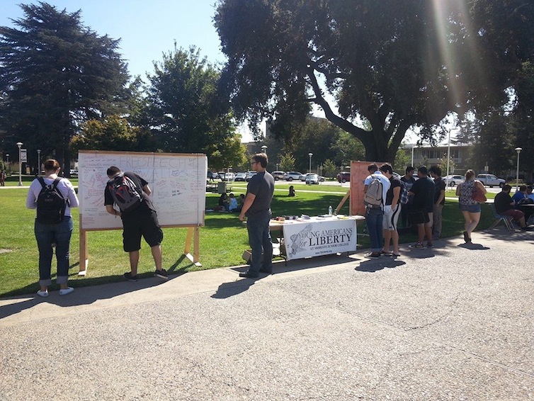 The result? Yesterday, Robert and his colleagues in the college’s Young Americans for Liberty chapter were able to hand out copies of the Constitution, engage their fellow students, and collect a wide variety of viewpoints on a Free Speech Wall.