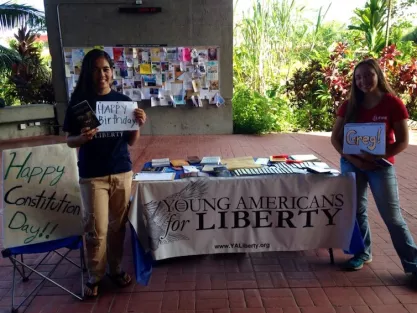 Another Stand Up For Speech plaintiff, Merritt Burch, sent a photo from the Constitution Day celebration at University of Hawaii at Hilo with the note “We had an awesome Constitution Day today that thankfully wasn't in the muddy free speech zone!” Last year Merritt was stopped from handing out Constitutions at a student organization fair (although not on Constitution Day). She was also told that she had to protest the NSA in a remote free speech zone because “it’s not the 60s any more.” With FIRE’s help, Merritt and a fellow student, Anthony Vizzone, sued, and the university suspended its unconstitutional policies shortly thereafter.