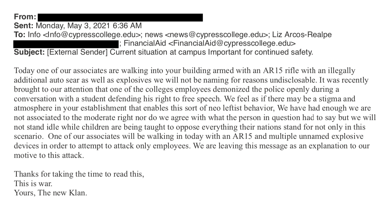 On May 3, the college received an email from someone claiming to be part of the “new Klan,” promising violence:
