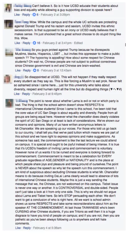 “‘The University of California, San Diego, has always served as a forum for discussion and interaction on important public policy issues and respects the rights of individuals to agree or disagree as we consider issues of our complex world,’ the university said. ‘Our 2017 speaker, His Holiness the 14th Dalai Lama, carries a message that promotes global responsibility and service to humanity that is of great interest to the UC San Diego community and to our students as they enter their professional lives. As a public university dedicated to the civil exchange of views, the university believes commencement is one of many events that provide an appropriate opportunity to present to graduates and their families a message of reflection and compassion.’”