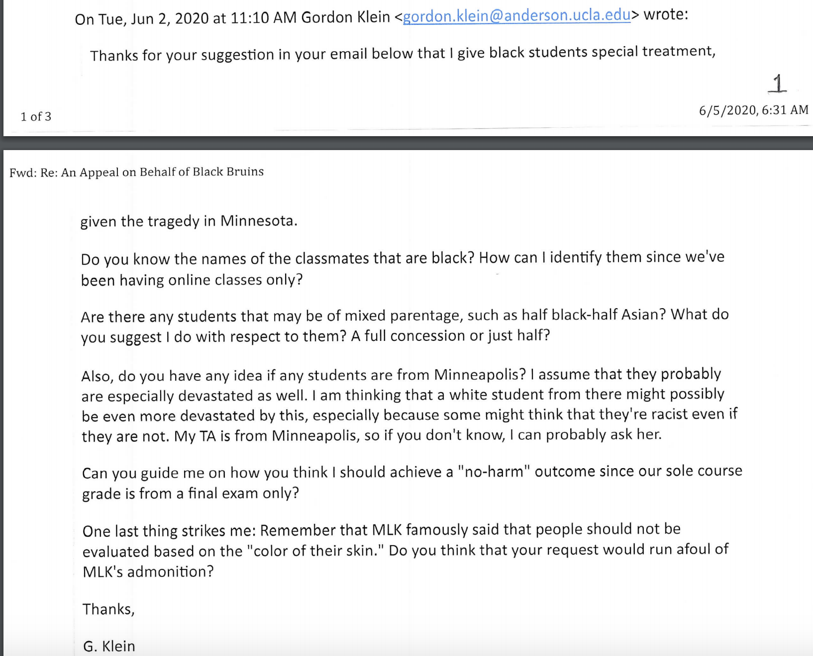 On June 2, a student emailed lecturer Gordon Klein to suggest he adjust his final exam requirements for black students due to the civil unrest. Suggestions included extending deadlines, shortening exams, and implementing a policy that would ensure an exam could only help, not harm, a student’s grade. Klein — who teaches accounting at UCLA’s business school — thanked the student and called the events in Minnesota a “tragedy,” but declined to change the final exam procedures, citing logistical concerns with identifying which students would be granted accommodations in a course conducted entirely online due to COVID-19.