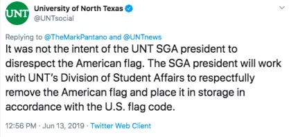 The University of North Texas issued a statement via Twitter announcing Ogbu would be working with UNT’s Division of Student Affairs “to respectfully remove the American flag and place it in storage in accordance with the U.S. [F]lag [C]ode.” While some find Ogbu’s display disrespectful of the American flag, it is clearly expression protected by the First Amendment, and no law, including the Flag Code, can impose criminal or civil consequences for such expression.