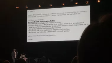 Buress was booked to perform at an annual event open to students for Loyola’s Department of Programming at the Gentile Arena on campus. According to reports from the Loyola Phoenix, Loyola’s campus newspaper, Buress had his mic cut off just five minutes after his act started when he projected an email containing the school’s restrictions on his performance onto a screen on stage (pictured above) — including a ban on content involving rape, sexual assault, race and sexual orientation — started making fun of them, and then made at least one joke about sexual assault within the Catholic Church after his mic was cut off.
