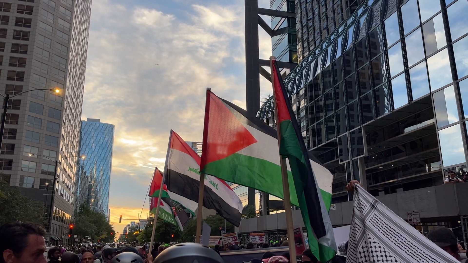 Pro-Palestinian protesters wave flags outside the Democratic National Convention in Chicago.