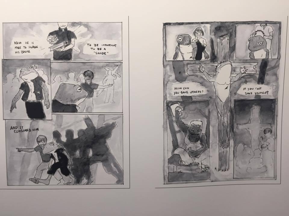 Beyond the fact that what some call hate speech is usually protected by the First Amendment, this characterization is particularly interesting in light of the installation’s context. The work is part of a larger exhibit from the university’s interdisciplinary TransMedia Narratives program, which brings together students studying art, psychology, game modeling, writing, graphic novels, web development, and video production to create thematically linked projects. Smith created the work to accompany a graphic novel which students, including Smith, collaborated on. The installation reflects one of the final scenes in the graphic novel, when a “man of the church,” who is slowly transforming into a frog as he pursues a selfish quest to become a savior in his own right, is crucified when the metamorphosis is complete. While the artist’s intent does not negate the feelings of the protestors, this is a prime example of how one person’s “anti-Christian hate speech” can be another person’s morality tale laden with Christian themes.