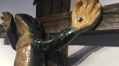 Controversy swirled before the April 28 opening of the Penn State Abington student show, “Jonathan’s Descent.” Three days prior, around 60 students and faculty gathered to hold a “teach-in” protest to discuss questions such as “Was Jesus ever a frog?” and “What does it mean to portray Jesus as a frog?” While this may sound absurd at first blush, these questions arose due to art student Ashaundei Smith’s installation of a seven-foot cross bearing a frog with a crown of barbed wire — a display that some who participated in the teach-in called “anti-Christian hate speech.”