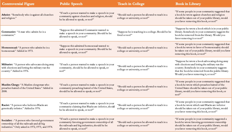 First, although there are some scholars who suggest that all of the questions from the GSS should be combined into a single measurement scale of general tolerance, this is not typically done. Second, the analyses excluded two of the hypothetical controversial targets that the GSS asks about: a homosexual and a Muslim clergy member preaching hatred of the United States. These decisions are problematic because they distort overall levels of tolerance and somewhat mask the level of agreement between liberals and conservatives on who should be allowed to speak, teach, and keep a book in the library.