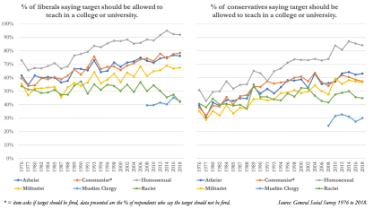 In sum, although the AAUP’s data snapshot brings attention to the important issue of academic freedom and attempts to ascertain what the American public may think about the issue, it is not clear that the analysis tells us much about people’s attitudes toward academic freedom. This is because the questions used in the analyses from the GSS have long been considered measures of political tolerance, a related but presumably distinct construct. Firm conclusions about what the American public thinks about academic freedom require data that more narrowly assesses such attitudes. Furthermore, the decision to collapse controversial figures and venues into a single measure of tolerance distorts conclusions about the overall levels of tolerance for most of the controversial figures the GSS asks about. It also masks some prominent similarities in tolerance among liberals and conservatives with regard to who can speak in one’s local community, who can teach in a college or university, and who can have a book in the public library. This more detailed analysis reveals that a good number of both liberals and conservatives are tolerant of controversial views in a university setting, however this tolerance is less likely to be extended to a professor who is racist or a professor who is a Muslim clergy member known for preaching hatred of the United States.