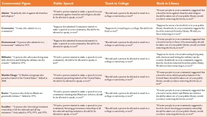 Second, the analyses exclude two of the controversial figures the GSS asks about: a homosexual and a Muslim clergy member preaching hatred of the United States. Excluding these figures from the analyses underestimates the overall tolerance for controversial figures and masks a good deal of agreement between liberals and conservatives on who should be allowed to speak, teach, and keep a book in the public library.