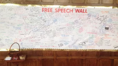 The conference was off to a roaring start Friday night with Lenore Skenazy’s fun and thought-provoking keynote speech. With the help of a Pop-Tart, Skenazy discussed the harmful parenting trend of treating potential harm as real harm and how this has played a role in creating college students who are all too passive about overbearing speech codes. Sadly though, real harm came to the conference’s seven-foot Free Speech Ball, which met its ultimate demise later on in the night when it popped. The Free Speech Wall, thankfully, survived the whole weekend.
