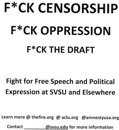 "It is difficult to understand how SVSU administrators, after consulting with a lawyer, could believe they have the right to censor political speech that contains profanity—even censored profanity—when the Supreme Court has made clear that the exact opposite is true," said FIRE Director of Speech Code Research Samantha Harris. "While their apparent dislike for expletives may be sincere, President Gilbertson and his administration must know that their actions violate the First Amendment. They need to understand that, just like Americans' other civil rights, the First Amendment is not optional, and that as public servants, constitutional obligations come first."
