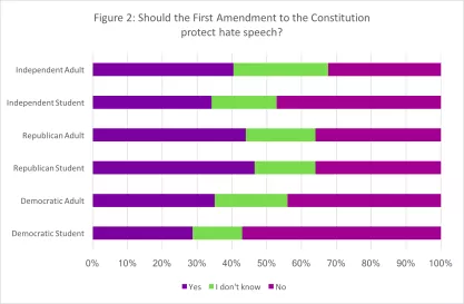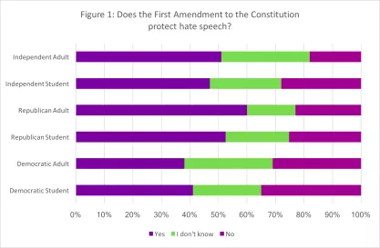 Independent, Republican, and Democratic adults report similar answers to their respective college student partisans when asked about hate speech protections. Figure 1 shows that higher proportions of Republican adults (60 percent) and college students (52 percent) recognize that hate speech is protected by the First Amendment than Independent and Democratic adults and college students.