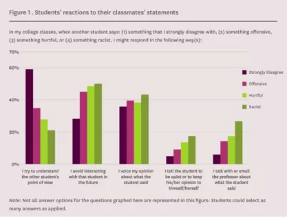 We provide an in-depth discussion of the responses to this series of questions in our report. Here, though, we will discuss why we chose to allow students to bring their own subjective definitions of the terms “offensive,” “hurtful,” and “racist” to the survey.