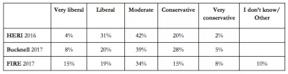 Despite the shortcomings with current data, it is important to compare the partisan and ideological breakdown of our survey’s respondents to the partisan and ideological breakdowns found in similar surveys of college students. In Tables 1 and 2, we refer to the following surveys: HERI 2016, Villasenor 2017, Bucknell 2017, and FIRE 2017.