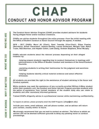 My group, CHAP, is a separate group. The main thing we do is serve as advisors for students facing alleged honor and conduct violations. We also sit in on the bylaw reviews and go over the school’s honor code and conduct code and discuss ways to make things better.