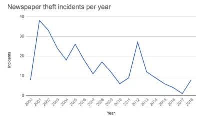 The SPLC tracks student newspaper theft. In 2018, they tallied eight such incidents, the highest number since 2014. In 2017, the group only recorded one instance.