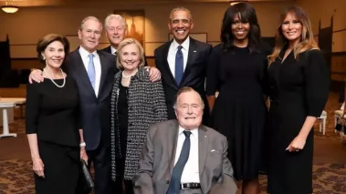 Former Presidents George W. Bush, Bill Clinton, George H.W. Bush and Barack Obama pose with former first ladies Laura Bush, Hillary Clinton, Michelle Obama, and first lady Melania Trump. Each was disinvited or threatened with disinvitation except Bill Clinton and Melania Trump. (Paul Morse/Office of George H.W. Bush)