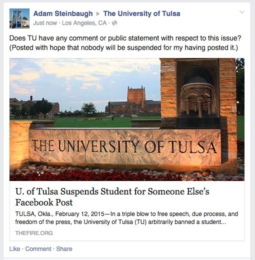TU’s censors, apparently on a mission to eradicate any unflattering Facebook posts mentioning the university or its administration from the Internet, have begun to hide posts from TU’s own Facebook page. Although TU’s “About” page asserts the private university’s dedication to inspiring “free inquiry” and educating students to “think critically,” FIRE noticed yesterday that TU was censoring every post linking to FIRE’s press release or mentioning Barnett’s case.