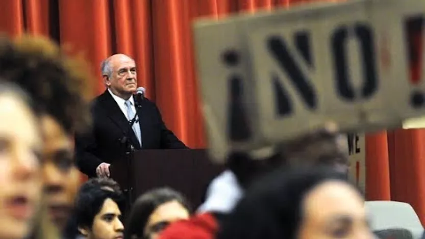 As soon as Murray took the stage, students stood up, turned their backs to him and started various chants that were loud enough and in unison such that he could not talk over them.