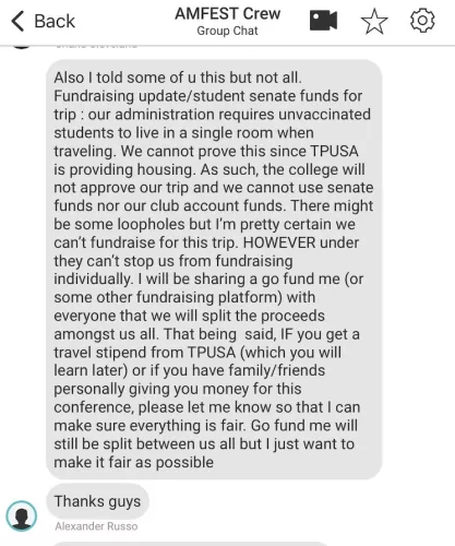 Home Research & Learn Contents Table of Contents AmericaFest Group Chat Messages, October 25, 2021 Related pages Case: Elizabethtown College: TPUSA Chapter Sanctioned for ‘Fraudulent’ Statement in Online Fundraiser School: Elizabethtown College