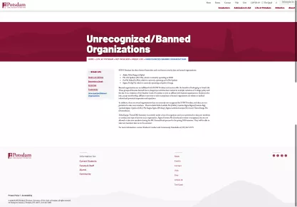 Home Research & Learn Contents Table of Contents Deleted SUNY Potsdam List of Banned Organizations Related pages Case: State University of New York at Potsdam: Restrictions on Students Associating with “Banned” Organizations School: State University of New York - Potsdam