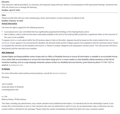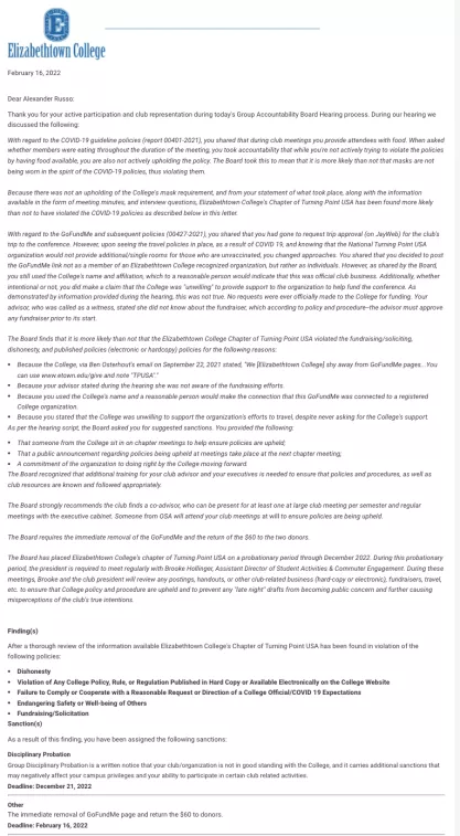 Elizabethtown College Decision Letter to Alexander Russo, February 16, 2022
