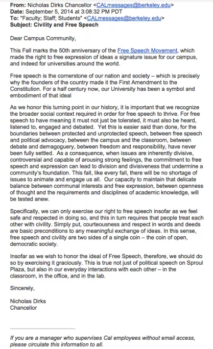 Home Research & Learn Contents Table of Contents Email from University of California, Berkeley Chancellor Nicholas Dirks Regarding "Civility" Related pages School: University of California, Berkeley