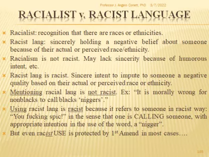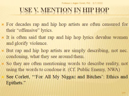 Home Research & Learn Contents Table of Contents Professor J. Angelo Corlett Slides Related pages Case: San Diego State University: Professor Reassigned for Quoting Epithets, Teaching Use-Mention Distinction School: San Diego State University