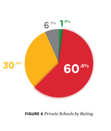 Of the 104 private colleges and universities reviewed, 63 (60.6%) received a red light rating, 32 (30.8%) received a yellow light rating, 2 (1.9%) received a green light rating, and 7 (6.7%) were not rated.