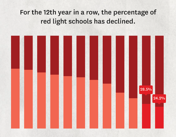 - The percentage of schools earning an overall “red light” rating in FIRE’s Spotlight database has gone down for the twelfth year in a row, this year to 24.2%. This is over a four percentage point drop from last year, and is exactly 50 percentage points lower than the percentage of red light institutions in FIRE’s 2009 report.