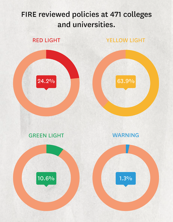 Of the 471 schools reviewed by FIRE, 114, or 24.2%, received a red light rating. 301 schools received a yellow light rating (63.9%), and fifty received a green light rating (10.6%). Six schools earned a Warning rating (1.3%).[4]
