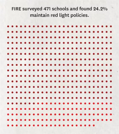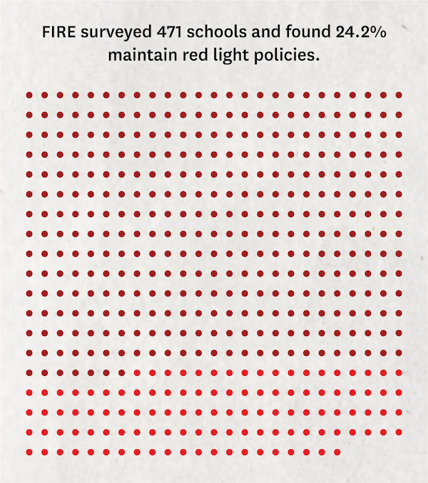 For this report, FIRE surveyed the written policies of 471 colleges and universities, evaluating their compliance with First Amendment standards. Overall, 24.2% of surveyed colleges maintained at least one severely restrictive policy that earned FIRE’s worst, “red light” rating, meaning that it both clearly and substantially restricts protected speech. This is the twelfth year in a row that the percentage of schools earning a red light rating has gone down; last year, 28.5% of schools earned a red light rating.