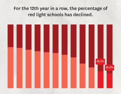 - The percentage of private universities earning a red light rating, which stood at 47.1% last year, continued to decrease, coming in at 44.8% this year.