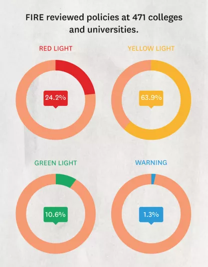 FIRE rates colleges and universities as “red light,” “yellow light,” or “green light” institutions based on how much, if any, protected expression their written policies governing student conduct restrict. The speech code ratings do not take into account a university’s “as-applied” violations of student speech rights or other cases of censorship, student- or faculty-led calls for punishment of protected speech, and related incidents. Monitoring and rating such incidents consistently across 471 institutions with accuracy is not feasible and is beyond the scope of this report.