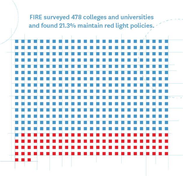 FIRE rates colleges and universities as “red light,” “yellow light,” or “green light” institutions based on how much, if any, protected expression their written policies governing student conduct restrict. The speech code ratings do not take into account a university’s “as-applied” violations of student speech rights or other cases of censorship, student- or faculty-led calls for punishment of protected speech, and related incidents and controversies. Monitoring and rating such incidents consistently across 478 institutions with accuracy is not feasible and is beyond the scope of this report.
