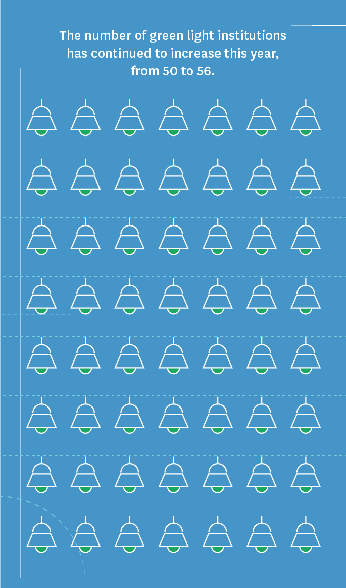 The number of green light institutions has continued to rise this year, from 50 institutions last year to 56 now.[8] At 11.7%, the percentage of green light schools is at an all-time high, with more than one million students across the country enrolled at green light colleges and universities.[9]