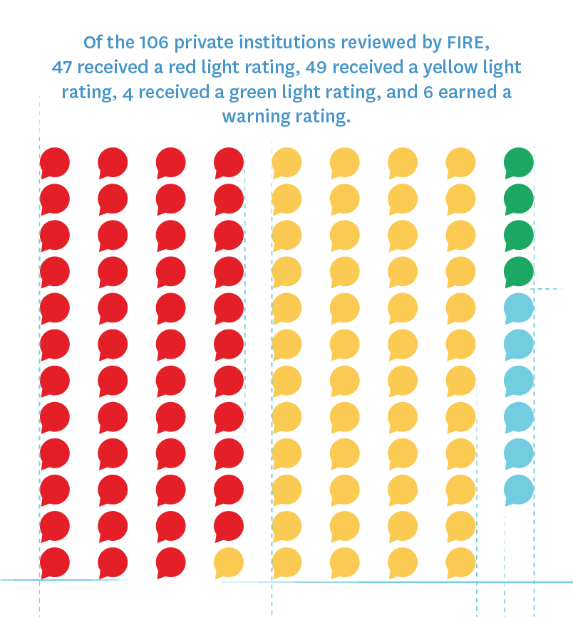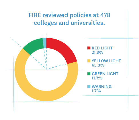 Of the 478 schools reviewed by FIRE, 102, or 21.3%, received a red light rating. 312 schools received a yellow light rating (65.3%), and 56 received a green light rating (11.7%). Eight schools earned a Warning rating (1.7%).[6]