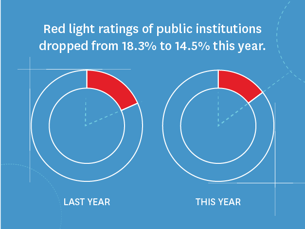 - A total of 56 colleges and universities now earn an overall “green light” rating, up from 50 schools as of last year’s report. Policies earn a green light rating when they do not seriously threaten protected expression. Significantly, there are now nearly the same number of public schools earning a green light rating (52) as there are earning a red light rating (54).