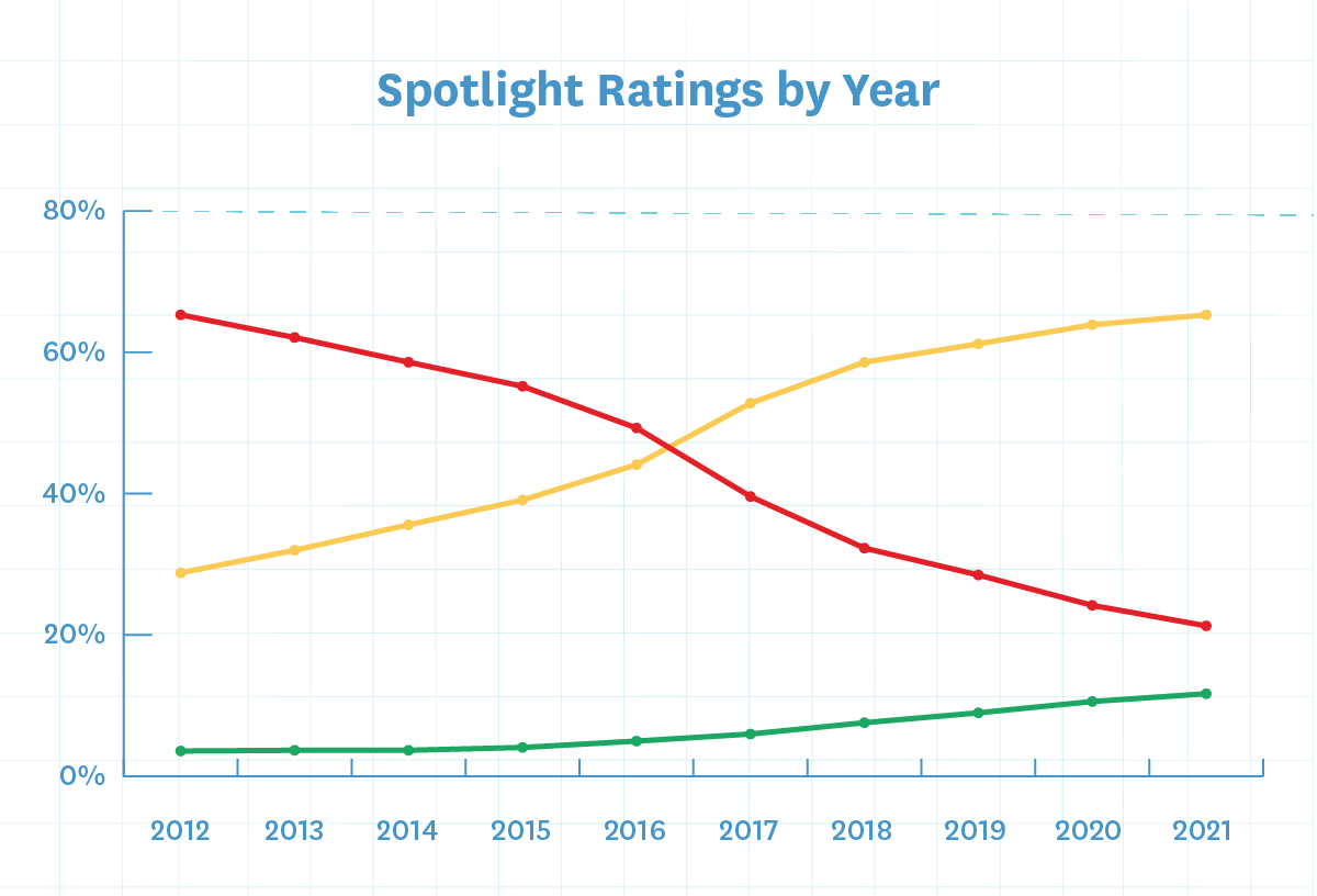 - The percentage of schools earning an overall “red light” rating in FIRE’s Spotlight database has gone down for the thirteenth year in a row — this year to 21.3%. This is approximately a three percentage point drop from last year, and is over 50 percentage points lower than the percentage of red light institutions in FIRE’s 2009 report.