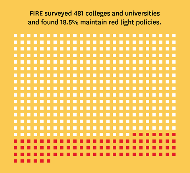 FIRE rates colleges and universities as “red light,” “yellow light,” or “green light” institutions based on how much, if any, protected expression their written policies governing student conduct restrict. The speech code ratings do not take into account a university’s “as-applied” violations of student speech rights or other cases of censorship, student- or faculty-led calls for punishment of protected speech, and related incidents and controversies. Monitoring and rating such incidents consistently across 481 institutions with accuracy is not feasible and is beyond the scope of this report.
