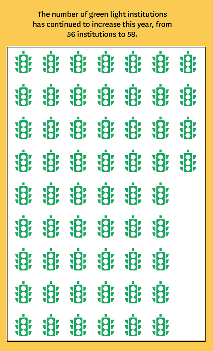 The number of green light institutions has continued to rise this year, though only slightly, from 56 institutions last year to 58 now.[7] At 12.1%, the percentage of green light schools is at an all-time high, with more than one million students across the country enrolled at green light colleges and universities.[8]